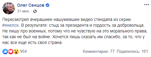 "Пересмотрел вчерашнее нашумевшее видео стендапа из серии #янелох. В результате: стыд за президента и гордость за добровольца. Не пишу про военных, потому что не чувствую на это морального права, так как не был на войне. Хочется лишь сказать им спасибо, за то, что у нас все еще есть своя страна", - написал он.