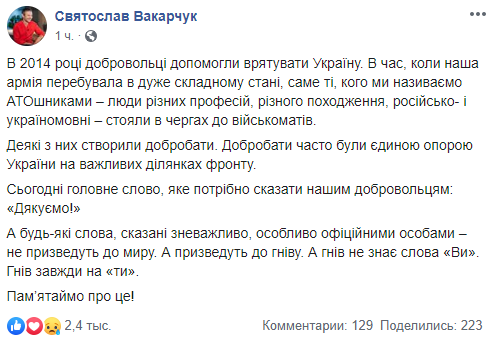 Вакарчук отметил, что нужно говорить "спасибо" украинским добровольцам.