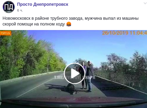 В городе Новомосковске, который находится в Днепропетровской области, 26 октября пациент скорой помощи выпал на проезжую часть из задних дверей кареты.