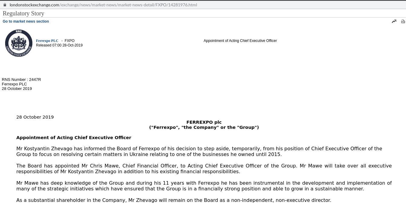 Компания Ferrexpo plc (Великобритания) заявляет, что ее акционер Константин Жеваго временно покидает пост генерального директора компании. Вместо него совет директоров назначил исполняющим обязанности гендиректора Криса Мэве.