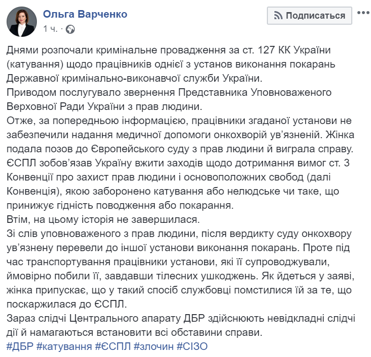 Начато уголовное производство по ст. 127 УК Украины (пытки) в отношении сотрудников одного из учреждений исполнения наказаний Государственной уголовно-исполнительной службы Украины. Сообщается, что поводом для этого послужило обращение представителя уполномоченного Верховной Рады по правам человека.