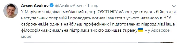 "В Мариуполе посетил мобильный центр ОЗСП НГУ "Азов", где готовят бойцов для наступательных операций и проводят огневые занятия из всего имеющегося в НГУ вооружения. Это одно из самых профессиональных и подготовленных подразделений. Наша философия максимальная поддержка тех, кто защищает Украину", - написал министр.