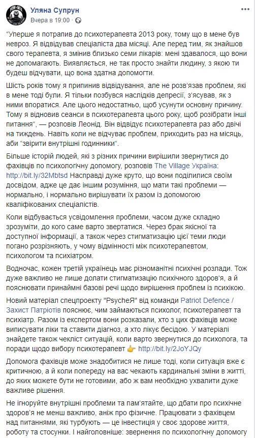 Супрун также добавила, что помощь специалистов может понадобиться не только тогда, когда ситуация уже является критической, но и когда впереди ждут кардинальные изменения в жизни, к которым не всегда можно быть готовыми, или когда необходимо принять очень важное решение.