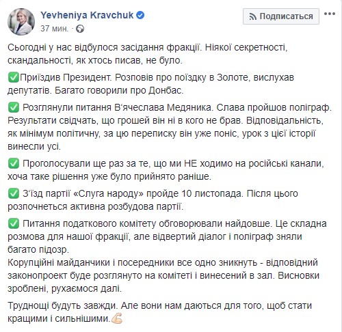 "Вопрос налогового комитета обсуждали дольше всех. Это сложный разговор для нашей фракции, но откровенный диалог и полиграф сняли много подозрений. Коррупционные площадки и посредники все равно исчезнут - соответствующий законопроект будет рассмотрен на комитете и вынесен в зал. Выводы сделаны, двигаемся дальше", - написала Кравчук.