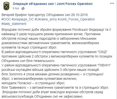 В течение понедельника, 27 октября, противник 5 раз нарушили режим прекращения огня на Донбассе, обстреляв позиции украинских подразделений из запрещенных минскими договоренностями автоматических гранатометов, крупнокалиберных пулеметов и другого стрелкового оружия.