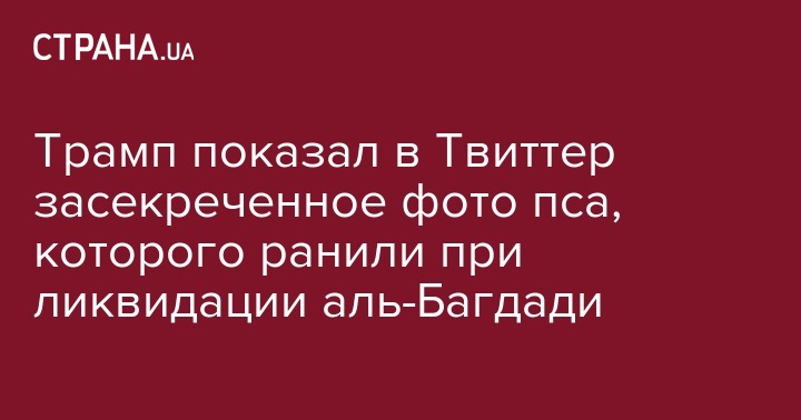 Американский президент Дональд Трамп опубликовал засекреченное до этого момента фото служебной собаки, которая принимала участие в рейде против предводителя террористов ИГИЛ Абу Бакра аль-Багдади и получила ранение.