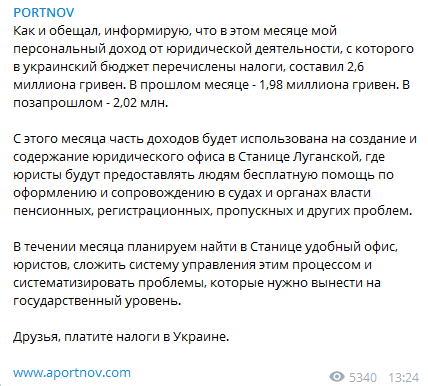 "С этого месяца часть доходов будет использована на создание и содержание юридического офиса в Станице Луганской, где юристы будут предоставлять людям бесплатную помощь по оформлению и сопровождению в судах и органах власти пенсионных, регистрационных, пропускных и других проблем. В течении месяца планируем найти в Станице удобный офис, юристов, сложить систему управления этим процессом и систематизировать проблемы, которые нужно вынести на государственный уровень", - написал Портнов.