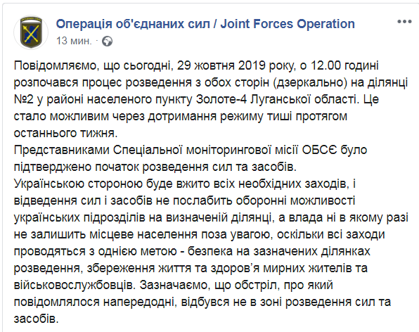 29 октября в 12:00 в зоне проведения операции Объединенных сил (ООС) на участке №2 в районе населенного пункта Золотое-4 Луганской области начался процесс разведения сил и средств. Об этом сообщает на Facebook пресс-центр ООС.