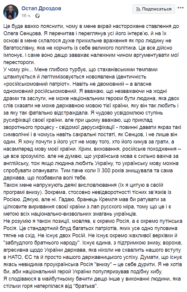 Журналист и ведущий программы "Drozdov: прямым текстом" Остап Дроздов" обеспокоился тем, что в Украине создают образ национального героя из Олег Сенцова, который совсем не говорит по-украински. Об этом Дроздов написал пространный пост на Facebook и порассуждал в своей передаче.