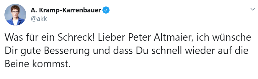 "Какой ужас! Дорогой Петер Альтмайер, я желаю тебе скорейшего выздоровления и чтобы ты поскорее вновь вышел на сцену", - говорится в твиттер-микроблоге главы Минобороны ФРГ Аннегрет Крамп-Карренбауэр.