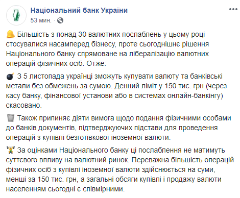 "Дневной лимит в 150 тыс. грн через кассу банка, финансового учреждения или в системах онлайн-банкинга отменен. Также прекращает действовать требование о предоставлении физическими лицами документов в банк, подтверждающих основания для проведения операций по покупке безналичной иностранной валюты", - говорится в сообщении.