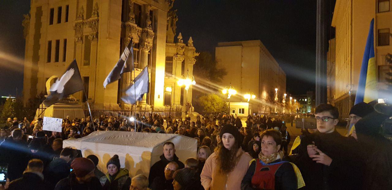 По словам спикеров митинга, отвод войск в Золотом - это подыгрывание Путину и проигрыш в войне. Участники митинга держат в руках плакаты с антипрезидентской риторикой. Кроме того, под ОП установили палатки. Охрану порядка обеспечивает полиция диалога, их не более 30 человек.