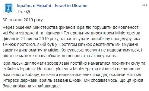 "Из-за решения Министерства финансов Израиля нарушить договоренности, которые были согласованы и подписаны Генеральным директором Министерства финансов 21 июля 2019 года, и применить одностороннюю процедуру, которая меняет протокол, который был в течение нескольких десятилетий, мы вынуждены закрыть дипломатическую миссию. Консульские услуги не будут предоставляться, и никто не будет иметь права въехать в посольство/консульство", - говорится в сообщении.