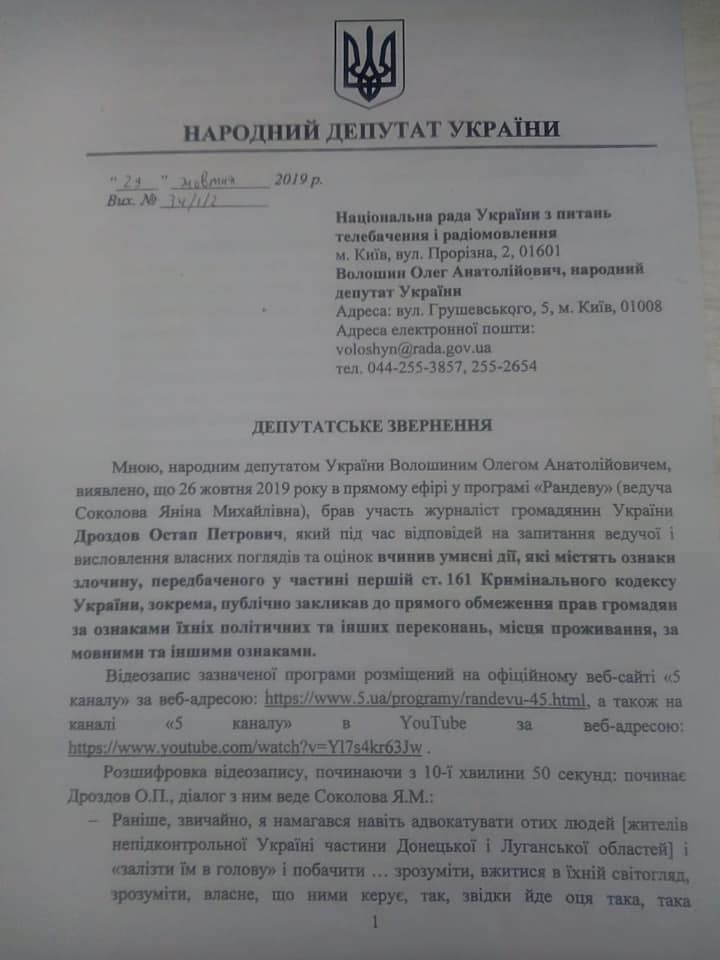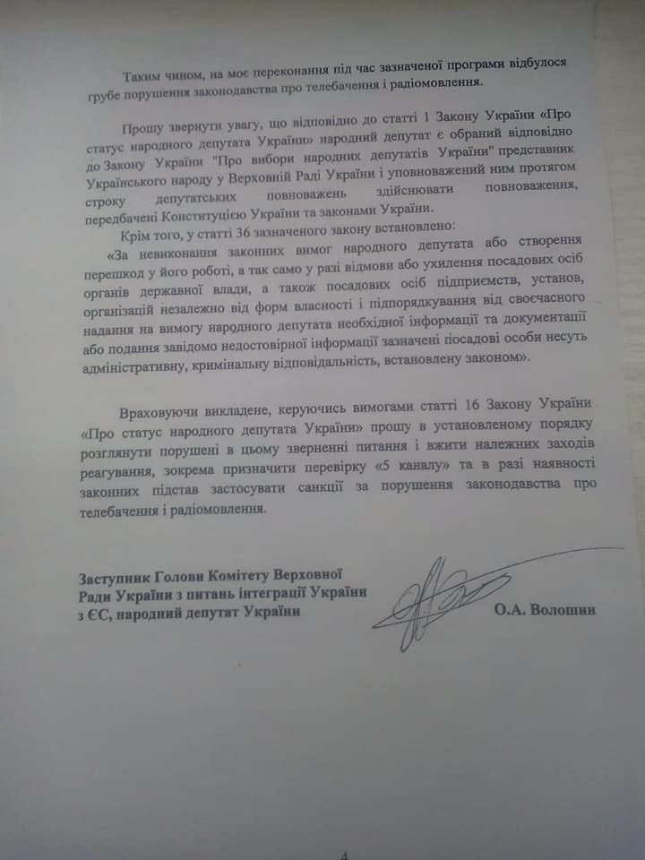 В связи с этим нардеп от "Оппозиционной платформы" Олег Волошин потребовал у Нацсовета провести проверку "5 канала".