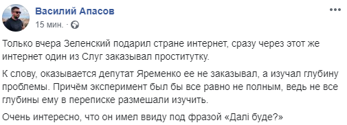 "Только вчера Зеленский подарил стране интернет, сразу через этот же интернет один из Слуг заказывал проститутку.