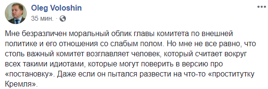 "Мне безразличен моральный облик главы комитета по внешней политике и его отношения со слабым полом. Но мне не все равно, что столь важный комитет возглавляет человек, который считает вокруг всех такими идиотами, которые могут поверить в версию про "постановку". Даже если он пытался развести на что-то "проститутку Кремля"", – пишет депутат Олег Волошин.