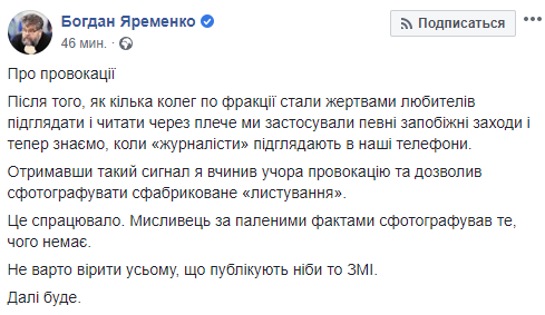 "После того, как несколько коллег по фракции стали жертвами любителей подглядывать и читать через плечо мы применили определенные меры предосторожности и теперь знаем, когда "журналисты" подсматривают в наши телефоны. Получив такой сигнал я подстроил вчера провокацию и позволил сфотографировать сфабрикованую "переписку", - написал нардеп.