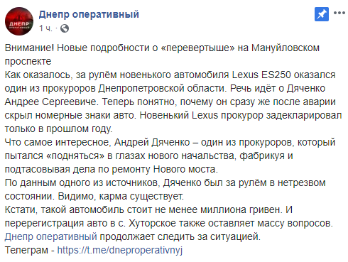 "Речь идет о Дяченко Андрее Сергеевиче. Теперь понятно, почему он сразу же после аварии скрыл номерные знаки авто. Новенький Lexus прокурор задекларировал только в прошлом году. Что самое интересное, Андрей Дяченко – один из прокуроров, который пытался "подняться" в глазах нового начальства, фабрикуя и подтасовывая дела по ремонту Нового моста. По данным одного из источников, Дяченко был за рулем в нетрезвом состоянии. Видимо, карма существует", - говорится в сообщении. Также уточняется, что такой автомобиль стоит не менее миллиона гривен.