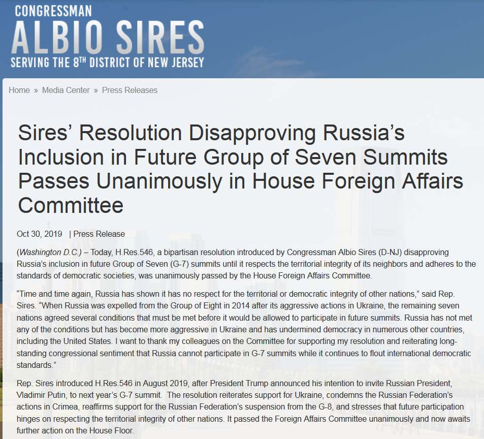 "Резолюция №546, представленная конгрессменом Альбио Сайресом, осуждающая приглашение России на будущие саммиты "Группы семи" (G-7), до тех пор, пока она не будет уважать территориальную целостность своих соседей и не последует стандартам демократических обществ, была единогласно принята Комитетом по иностранным делам Палаты представителей", - говорится в резолюции.