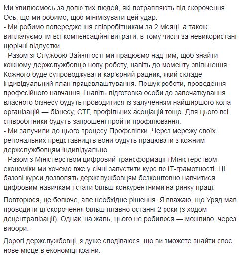 Каждому госслужащему обещают найти новую работу. К этому процессу привлекли профсоюзы, они будут работать с каждым госслужащим индивидуально. "Поиск работы, проведение профессионального обучения, а также подготовка лиц к началу собственного бизнеса будут проводиться с привлечением широкого круга организаций - бизнеса, ОТГ, профильных ассоциаций и тому подобное", - написал министр.