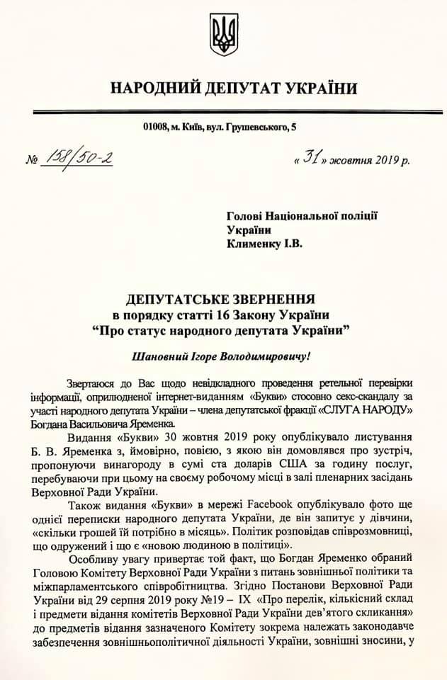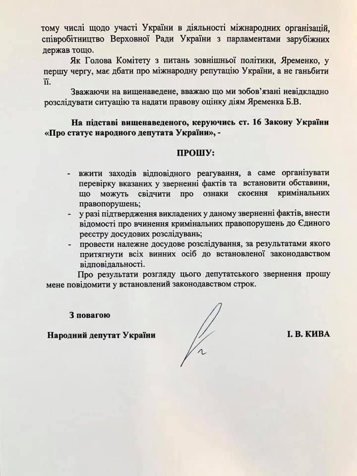 Кива опубликовал скан своего обращения. В документе депутат призывает Нацполицию тщательно проверить информацию относительно секс-скандала с участием Яременко.