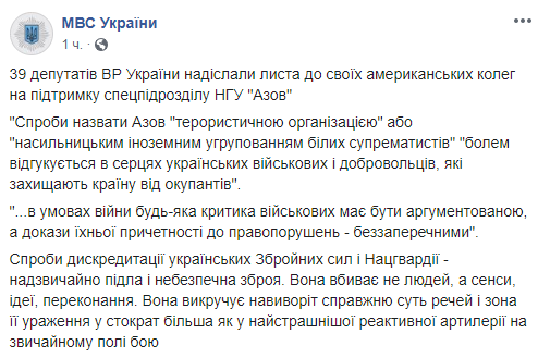 После того, как 40 американских конгрессменов потребовали у Госдепа признать украинский полк "Азов" террористической организацией, народные депутаты Верховной Рады направили письмо членам комитета палаты представителей конгресса США по внешней политике. Нардепы выразили свою поддержку спецподразделению Нацгвардии "Азов". Об этом сообщается на странице МВД Украины в соцсети.
