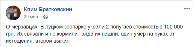 Как написал Братковский, укравшие попугаев "мерзавцы" держали пернатых связанными и не кормили. Когда несчастных мучеников нашли, один попугай умер на руках людей от истощения. К счастью, второй выжил.