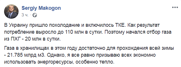 "В Украину пришло похолодание и включились ТКЭ (предприятия теплокоммунэнерго - Ред.). Как результат - потребление выросло до 110 млн (кубометров газа - Ред.) в сутки. Поэтому начался отбор газа из ПХГ - 20 млн в сутки", - сообщил Макогон.