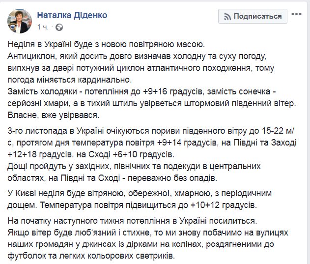 Сегодня, 3 ноября в Украину пожалуют воздушные массы с Атлантики, которые принесут тепло, ветер и нагонят тучи. Об этом сообщает в своем Facebook синоптик Наталья Диденко.