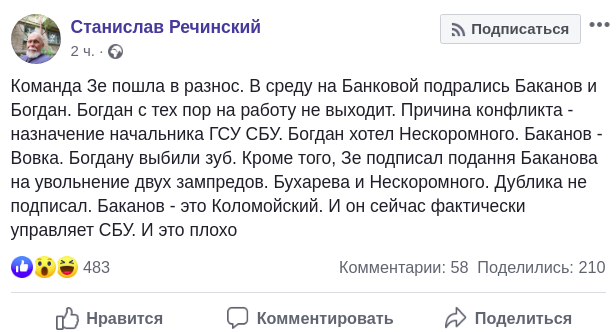 "Команда Зе пошла в разнос. В среду на Банковой подрались Баканов и Богдан. Богдан с тех пор на работу не выходит. Причина конфликта – назначение начальника ГСУ СБУ. Богдан хотел Нескоромного. Баканов – Вовка (который недавно вернулся в СБУ.– Ред.). Богдану выбили зуб. Кроме того, Зе подписал подання Баканова на увольнение двух зампредов. Бухарева и Нескоромного. Дублика не подписал. Баканов – это Коломойский. И он сейчас фактически управляет СБУ. И это плохо", - написал Речинский.