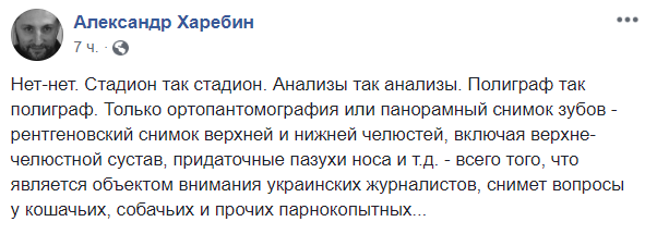 "Нет-нет. Стадион так стадион. Анализы так анализы. Полиграф так полиграф. Только ортопантомография или панорамный снимок зубов – рентгеновский снимок верхней и нижней челюстей, включая верхне-челюстной сустав, придаточные пазухи носа и т.д. – всего того, что является объектом внимания украинских журналистов, снимет вопросы у кошачьих, собачьих и прочих парнокопытных...".