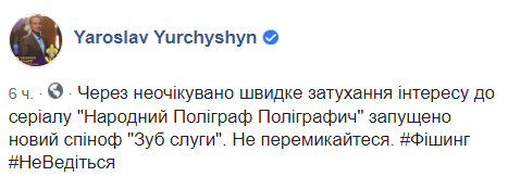"Из-за неожиданно быстрого затухания интереса к сериалу "Народный Полиграф Полиграфыч" запущен новый спинофф "Зуб слуги". Не переключайтесь", – иронизирует нардеп Ярослав Юрчишин.
