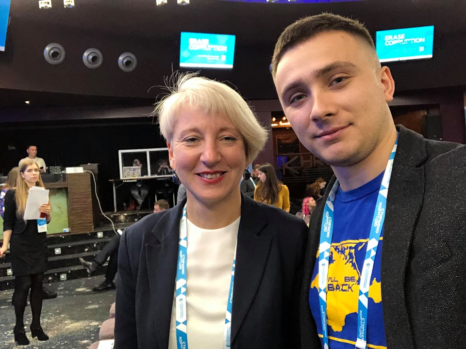 Праворадикал Сергей Стерненко, весной 2018 года убивший в Одессе человека, появился в Киеве на конференции Transparency International Ukraine "5 лет борьбы с коррупцией: ценности и практики" и сделал селфи с судьей из Полтавы.