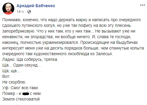 "Что у них там, кто у них там... Не вызывают уже ни ненависти, ни злорадства, ни вообще ничего. Я, слава те господи, наконец, полностью украинизировался. Происходящее на Выдубичах интересует меня уже на десять порядков больше, чем откинутые копыта очередного там художественного лизоблюда из Залесья. Не скорблю. Помер - и *уй с ним. Земля стекловатой", - отметил он.