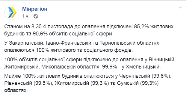 Министерство развития общин и территорий Украины обнародовало данные подключения отопления по состоянию на 08:30 4 ноября. Они опубликованы на странице ведомства в Facebook.