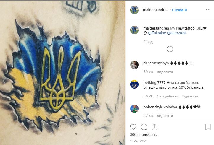 Ассистент главного тренера сборной Украины Андрея Шевченко Андреа Малдера сделал татуировку с гербом и флагом Украины. Фото рисунка на коже итальянский специалист опубликовал в Instagram.