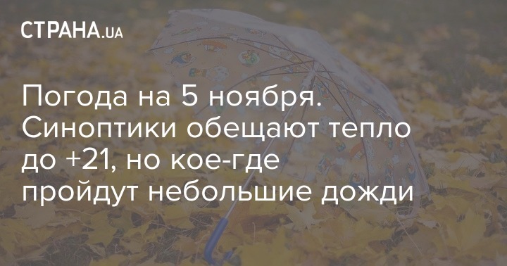 Во вторник, 5 ноября, в Украине установится теплая погода, местами воздух днем прогреется до +21, а на востоке и юге может пройти дождь. Об этом сообщает Укргидрометцентр.