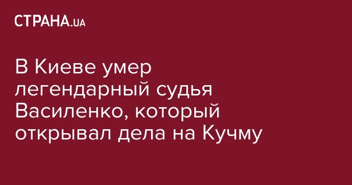Вечером в понедельник, 4 ноября, скончался легендарный судья киевского Апелляционного суда в отставке Юрий Василенко, который в 2002 году возбудил два уголовных дела против тогдашнего президента Леонида Кучмы. Об этом на своей странице в Facebook сообщил журналист Владимир Бойко.