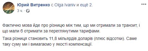 "Фактически речь идет о разнице между тем, что мы получили за транзит, и что должны бы были получить по пересмотренным тарифам. Такая разница составляет 11,8 миллиардов долларов (плюс проценты). Именно такую сумму мы и требуем в качестве компенсации", – так написал Ветренко в Facebook.