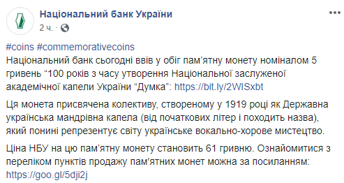 Национальный банк Украины (НБУ) ввел в обращение с 5 ноября памятные монеты "Казимир Малевич" номиналом 2 грн и "100 лет со времен создания Национальной заслуженной академической капеллы Украины "Думка" номиналом 5 грн (обе - из нейзильбера). Об этом сообщается на странице регулятора в соцсети.