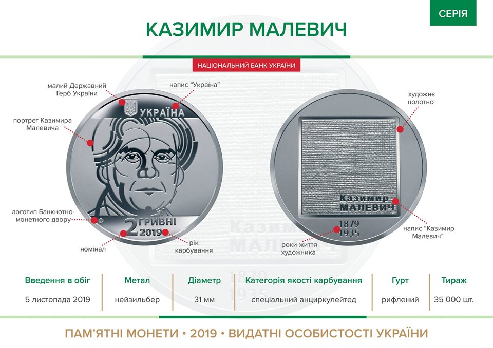 Тираж выпуска памятных монет "Казимир Малевич" - 35 тысяч штук, а розничная цена - 41 грн.