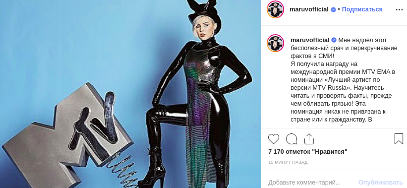 "Мне надоел этот бесполезный срач и перекручивание фактов в СМИ! Я получила награду на международной премии MTV EMA в номинации "Лучший артист по версии MTV Russia". Научитесь читать и проверять факты, прежде чем обливать грязью!" - заявила певица.