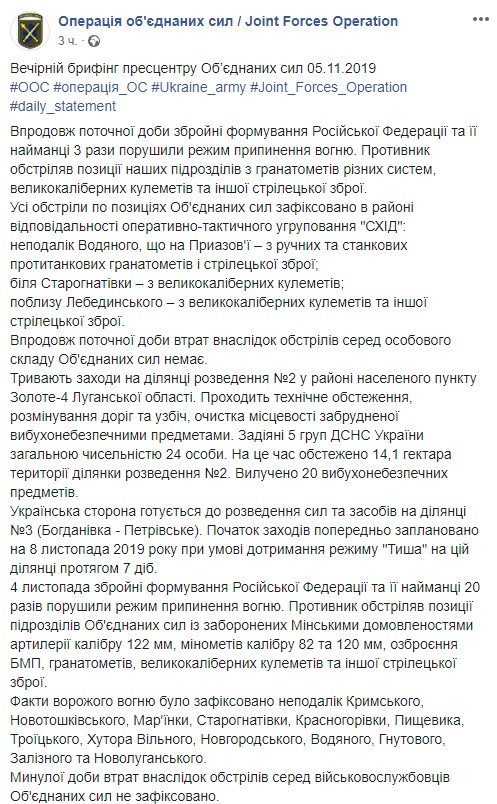 С начала суток вторника, 5 ноября, в районе проведения операции Объединенных сил на Донбассе противник совершил всего три обстрела. Об этом сообщили в пресс-службе ООС.