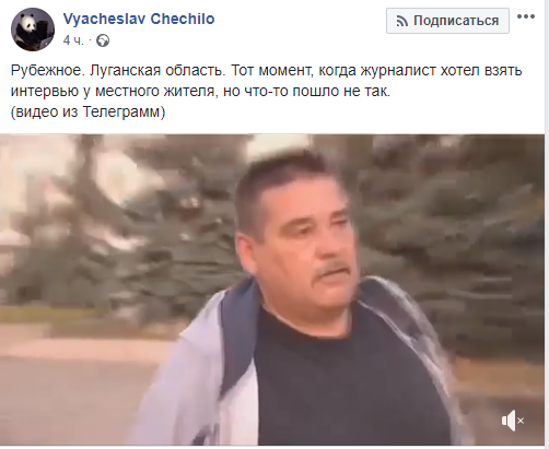 "Рубежное. Луганская область. Тот момент, когда журналист хотел взять интервью у местного жителя, но что-то пошло не так" - написал журналист Вячеслав Чечило.
