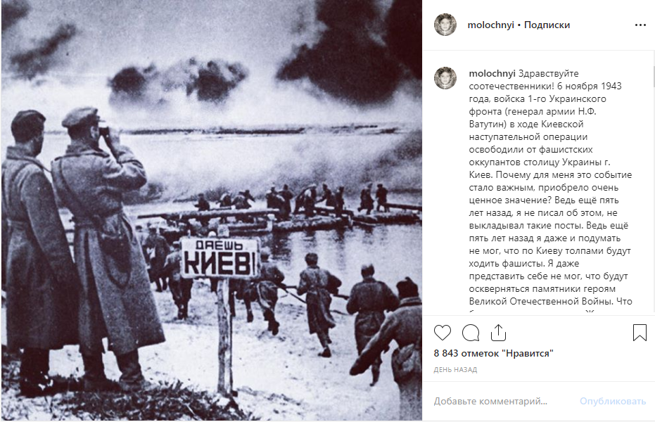 Украинский шоумен Андрей Молочный опубликовал в Инстаграм поздравление с днем освобождения Киева, которое отмечалось вчера, 6 ноября.