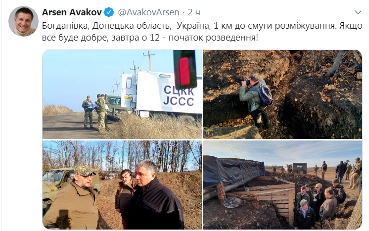"Богдановка, Донецкая область, Украина, 1 км до полосы разделения. Если все будет хорошо, завтра в 12 - начало разведения!" - написал Аваков в четверг.