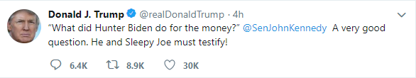 В четверг, 7 ноября, американский президент Дональд Трамп заявил, что бывшего вице-президента страны Джо Байдена и его сына Хантера необходимо допросить в Конгрессе. Об этом он написал в своем Твиттере.