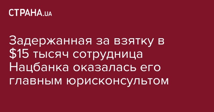 Задержанная сегодня сотрудница Национального банка Украины, вместе с посредником требовавшая от финансовой компании $30 тысяч взятки и получившая ее половину суммы за выдачу лицензии, оказалась главным юрисконсультом учреждения. Об этом сообщает на Facebook пресс-служба прокуратуры Киева.