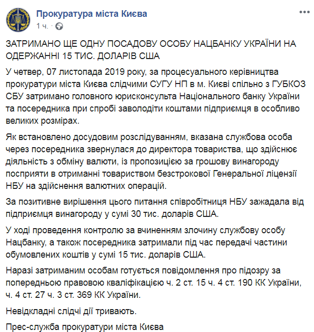 "Национальный банк пока не получил от правоохранительных органов детальной информации о задержании работницы, о котором сегодня вечером сообщено на сайте и на страницах в социальных сетях Национальной полиции города Киева и прокуратуры города Киева. Мы выясняем обстоятельства задержания и после получения уточненной информации предоставим развернутый комментарий", - написано в посте.