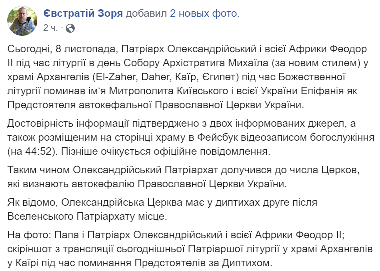 При этом он заявляет, что достоверность информации о поминании патриархом Феодором II Епифания как главы ПЦУ "подтверждена из двух информированных источников", а "официальное сообщение ожидается позже".